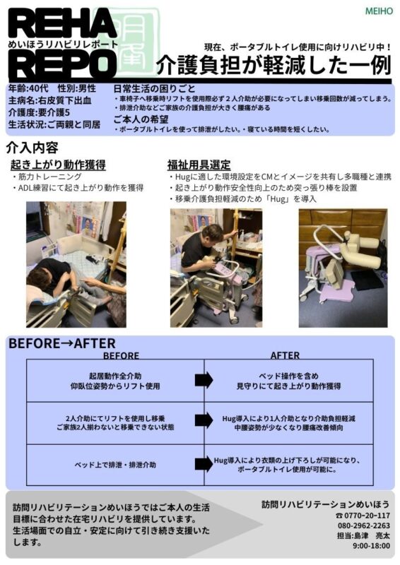 | サービスの内容 | 筋力・関節可動域・バランス能力の維持・向上 起き上がり・立ち上がり・歩行など基本動作のトレーニング 食事・更衣・入浴・排泄などの日常生活動作(ADL)のトレーニング ADLにおける巧緻動作の練習 嚥下機能評価・トレーニング 誤嚥予防のための食事姿勢・形態に関する指導 発声・発語・構音障害へのトレーニング ご家族への食事介助・コミュニケーション方法の指導 転倒予防や体力低下を防ぐ運動指導 福祉用具の選定・使用方法への助言 住宅環境(手すり位置・動線)設定 |